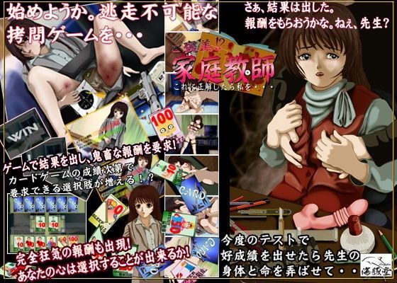 今度のテストで好成績をだせたら先生を○○していいよ… カードゲームで勝利し美人家庭教師を悶絶させる拷問ご褒美! 鬼畜度最大MAXの狂乱ゲーム!? さぁ、結果は出した。 報酬をもらおうかな。ねぇ、先生? 始めようか? 僕が考えた拷問ゲームを…。 ▽▲STORY▲▽ 罠に落ちた美人教師 沢田 優香(さわだ ゆうか) うけもった○供はわがままで残忍野卑…