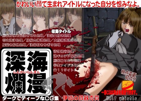 かわいい顔で生まれて、アイドルになってしまった自分の運命を呪いなよ。 学生アイドルが連れこまれたのは陰湿な地下室。そこには卑しく笑う男達の目。 大勢の男達に囲まれておびえる少女には今日という日に我が身に降りかかる地獄の運命は知らされていない。 【収録CGタイトル】 ■「逆ギロチン開腹処理」 ふりこのように天井から吊されゆらされている少女 床からはゆっくり…
